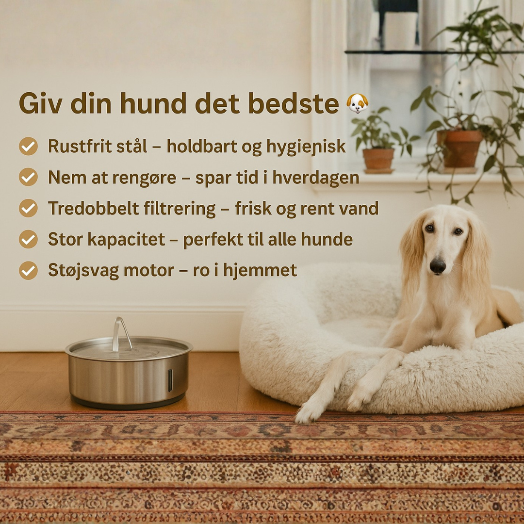 Hundefontæne Pro understøtter din hunds behov for ro og afslapning, så den drikker mere og holder sig sund – helt uden uro eller støj.